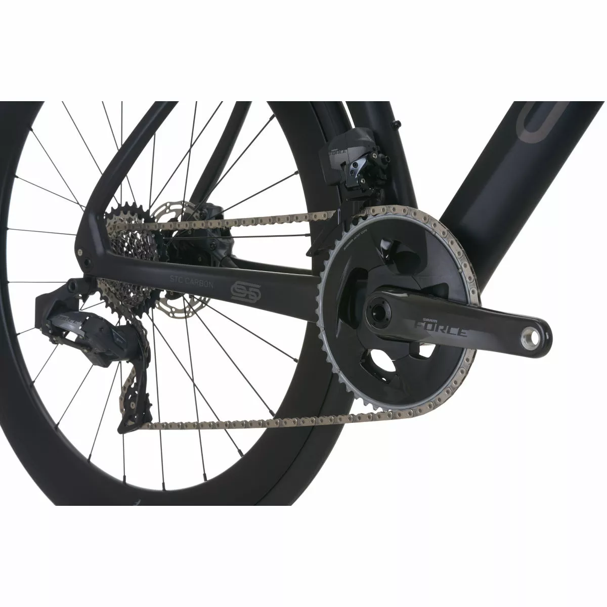 The Venturi STC is built with SRAM groupset technology for the first time. The wireless SRAM Force eTap AXS drivetrain on this model offers smartphone application syncing to view live battery life information and personalise shifting controls. The wide range 10-33T cassette specified with a super compact chainset offers fantastic gearing for sprinters and endurance riders alike. And the rear derailleur features SRAM Orbit damper technology for quiet and secure chain management over rough roads.